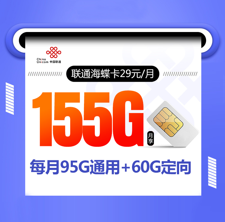 产品套餐:29元155G+通话0.1原资费构成:29元=30G定向+10元流量包/月;优惠后资费:29元/月=95G通用+60G定向;套外流量:流量5元/GB,国内通话0.1元/分钟,国内短/彩信0.