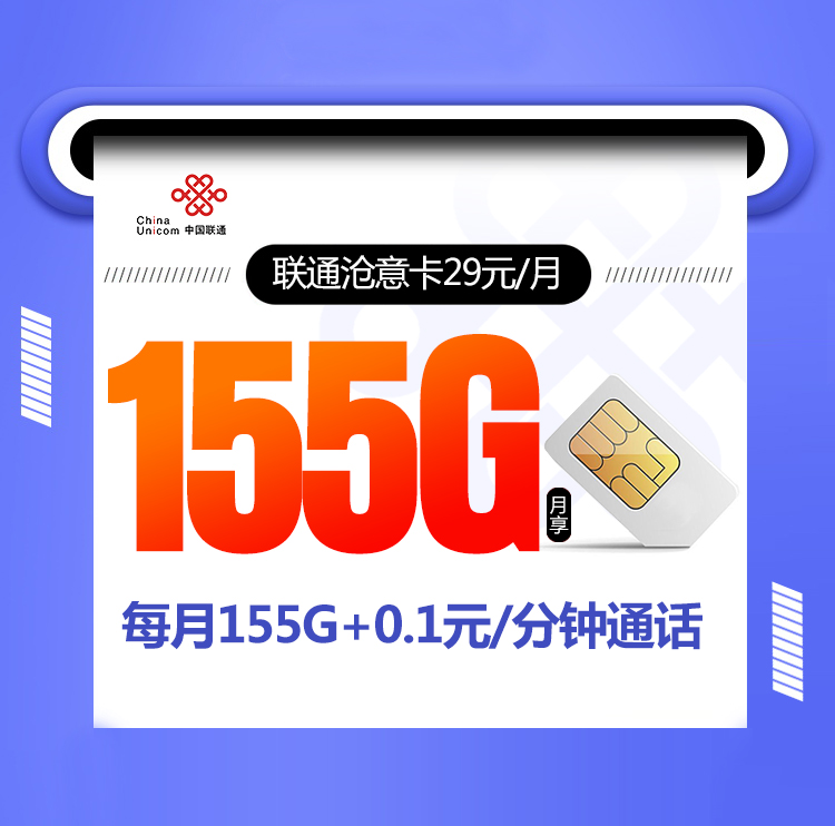产品套餐:29元155G+通话0.11.优惠后29元/月2.155G全国流量(首充到账后即可使用)3.通话0.1元/分钟优惠详情激活后任意渠道充值100元即可享受以下优惠:1.自动添加10元包95G通