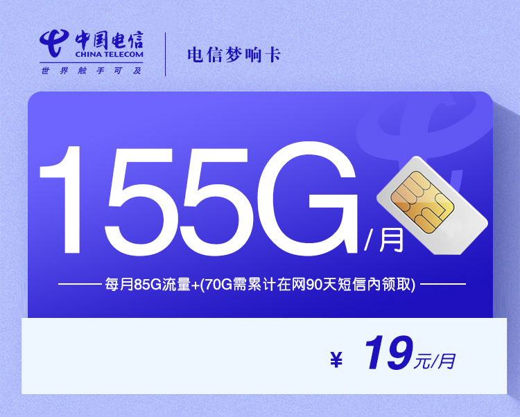 ‌产品套餐:19元85G+70G套餐官网月租39元[包含30GB定向流量+5GB通用流量],套餐外语音0.1元/分钟,短信0.1元/条。流量5元/GB。优惠详情激活当月专属渠道首充50元享受优惠不充值