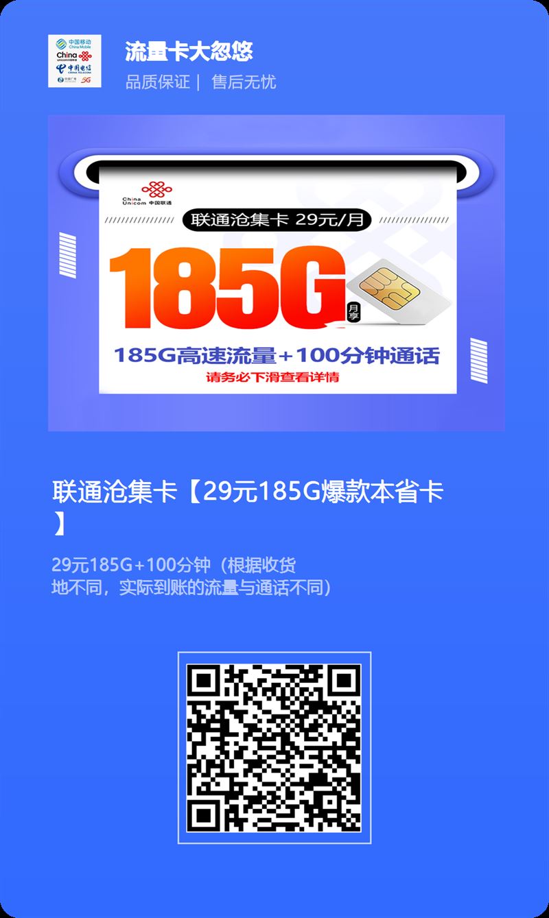 产品套餐:29元185G+100分钟原套餐:59元月租包含10G通用流量+100分钟通话,套餐外流量5元/G,通话0.15元,短彩信0.1元/条优惠后:29元185G高速流量+100分钟(参与首充活动
