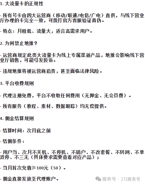 - 172号卡分销平台:连接运营商与代理商,提供号卡资源、推广工具、数据支持。