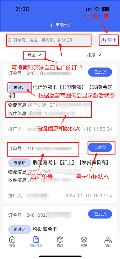 在“我的订单”处,可搜索和查看订单信息,如“订单号、物流信息、审核状态、是否激活、收件人信息等”。