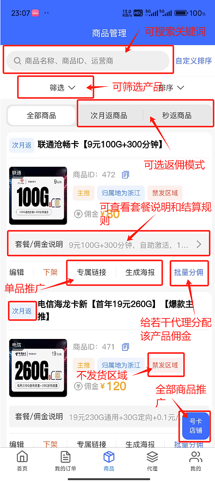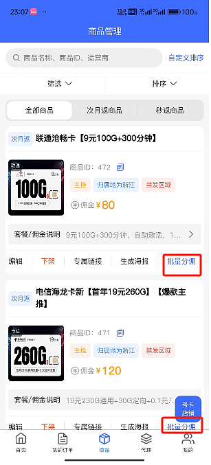 一、在“商品”点击“批量分佣”,可以给若干个代理设置该产品佣金和上架该产品。(比如你有80佣金,你设置70,那么你下级就是70佣金,你会赚取10元)