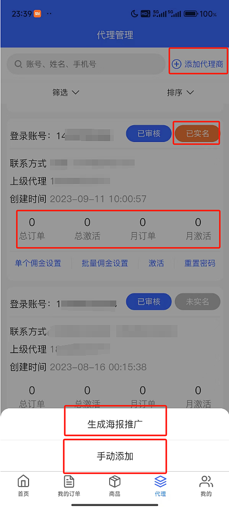 二、“手动添加”代理,此方法一般用于代理可能自己注册时无法收到验证码。