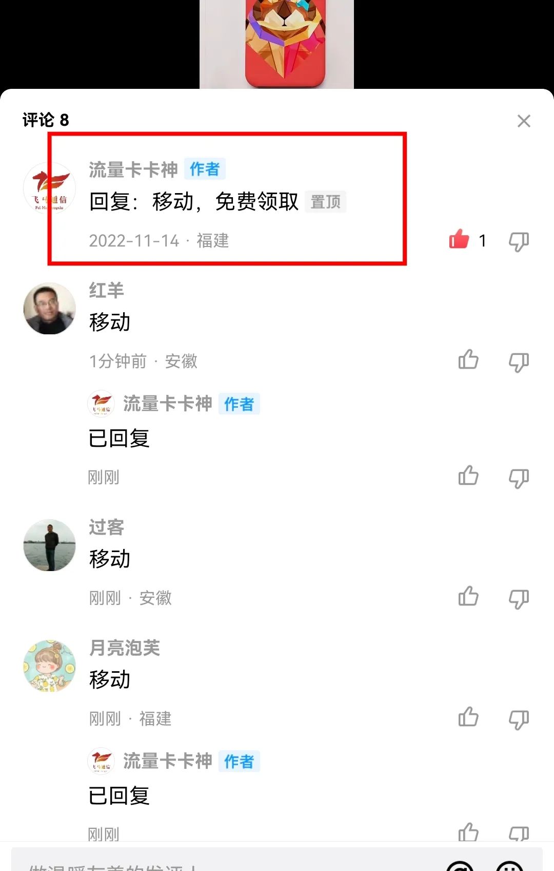 第二在评论区置顶一个互动的评论,有回复移动回复一或者回复联通。很多初中生会跟风互动,只要去回复他们评论就行