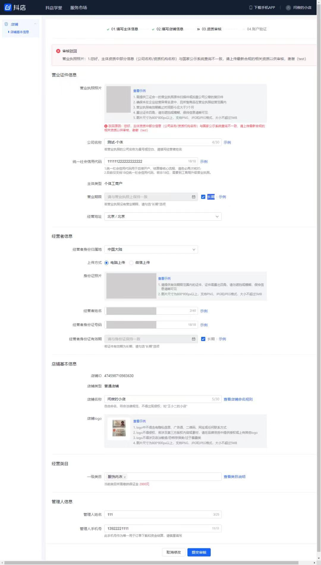 2.需填写:店铺基本信息、经营类目、品牌资质、店铺管理人信息