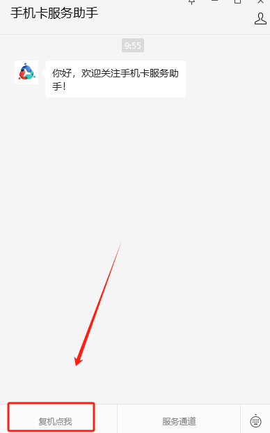2、进入公众号后,在主页菜单栏位置,点击【复机点我】,直接跳转至小程序,进行复机、注销、补换卡、携号转网等操作