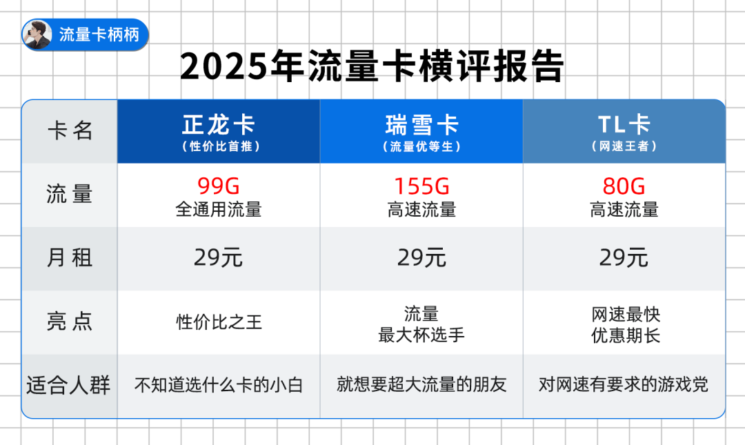 25年了,为了感谢大家的关注,柄柄给大家测评了目前所有可办的流量卡,共50张。经过月租、流量、优惠期、可发货地等对比,综合得分前3名的流量卡才会被推荐。