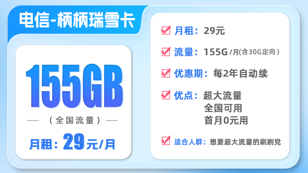 瑞雪卡套餐是29元155G,一张卡就能顶两张移动流量卡的总和,相当于直接省了一半的钱,一张卡用出两张流量卡效果。