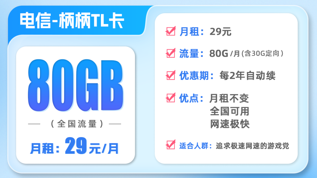 TL卡套餐是29元80G,在套餐优惠期上很有竞争力。首先是29元的月租永久不变的,不会像其他流量卡一样到期恢复39元月租。
