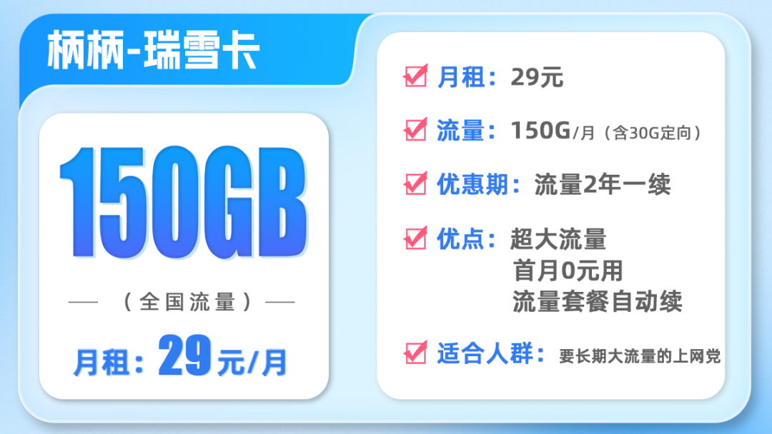 在优惠期内,瑞雪卡套餐是29元150G,大部分人一个月150G绝对够用了,不用再额外买流量包了,相当与省钱了。