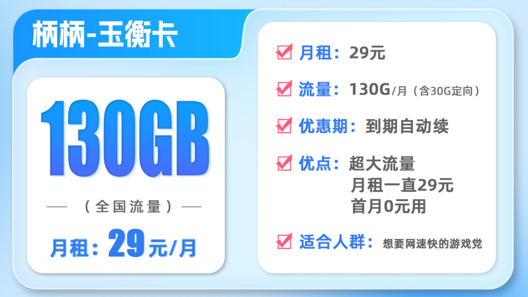 玉衡卡套餐是29元130G,大部分人刷刷视频,一个月差不多用一百G左右的话,办这张卡就能满足需求了。