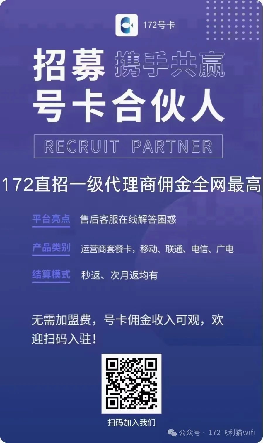 172号卡是运营商为拓展线上用户推出的分销平台,聚合了移动、联通、电信等运营商的高性价比流量卡。代理商通过推广这些卡,用户免费申请并激活后,即可获得佣金。平台主打“低门槛、高回报”,无需囤货、物流,只需专注推广。
