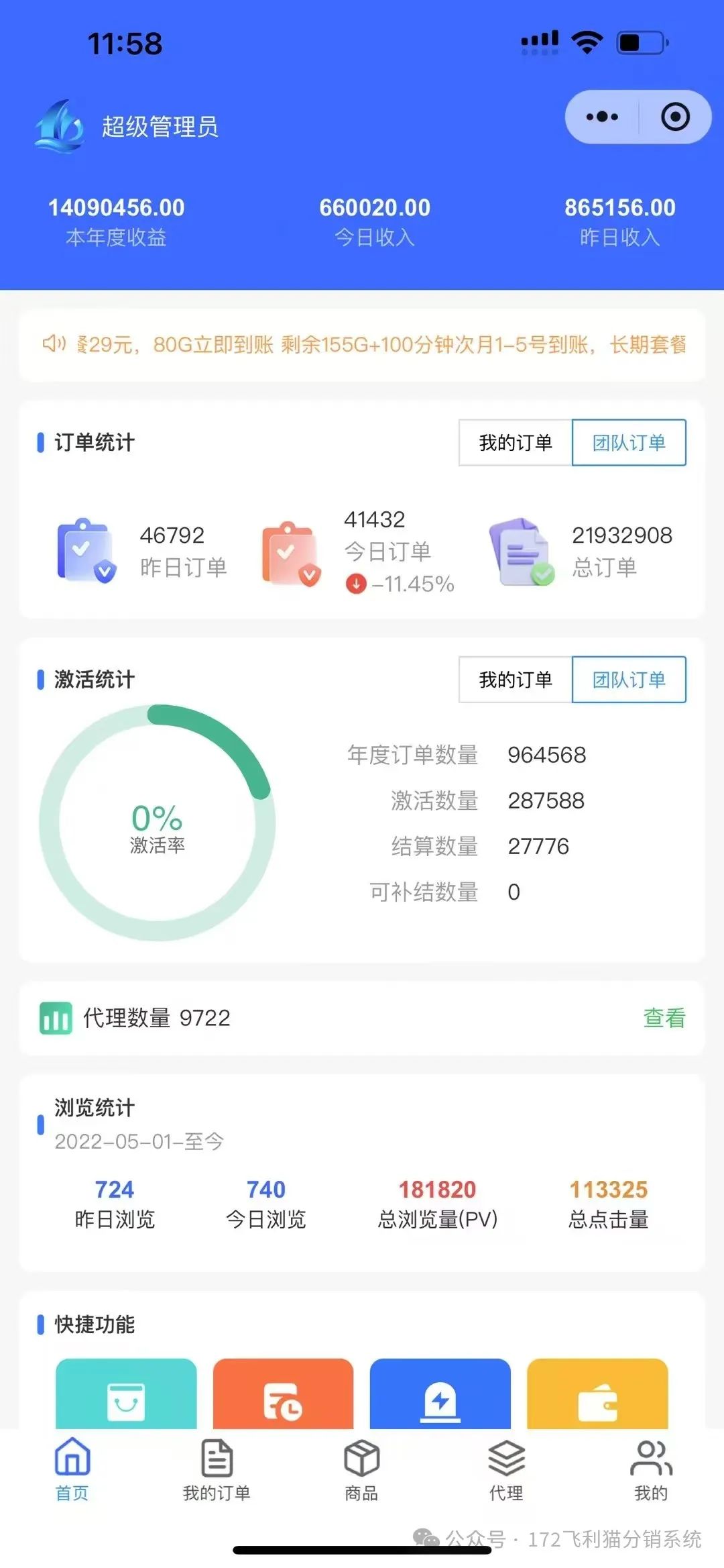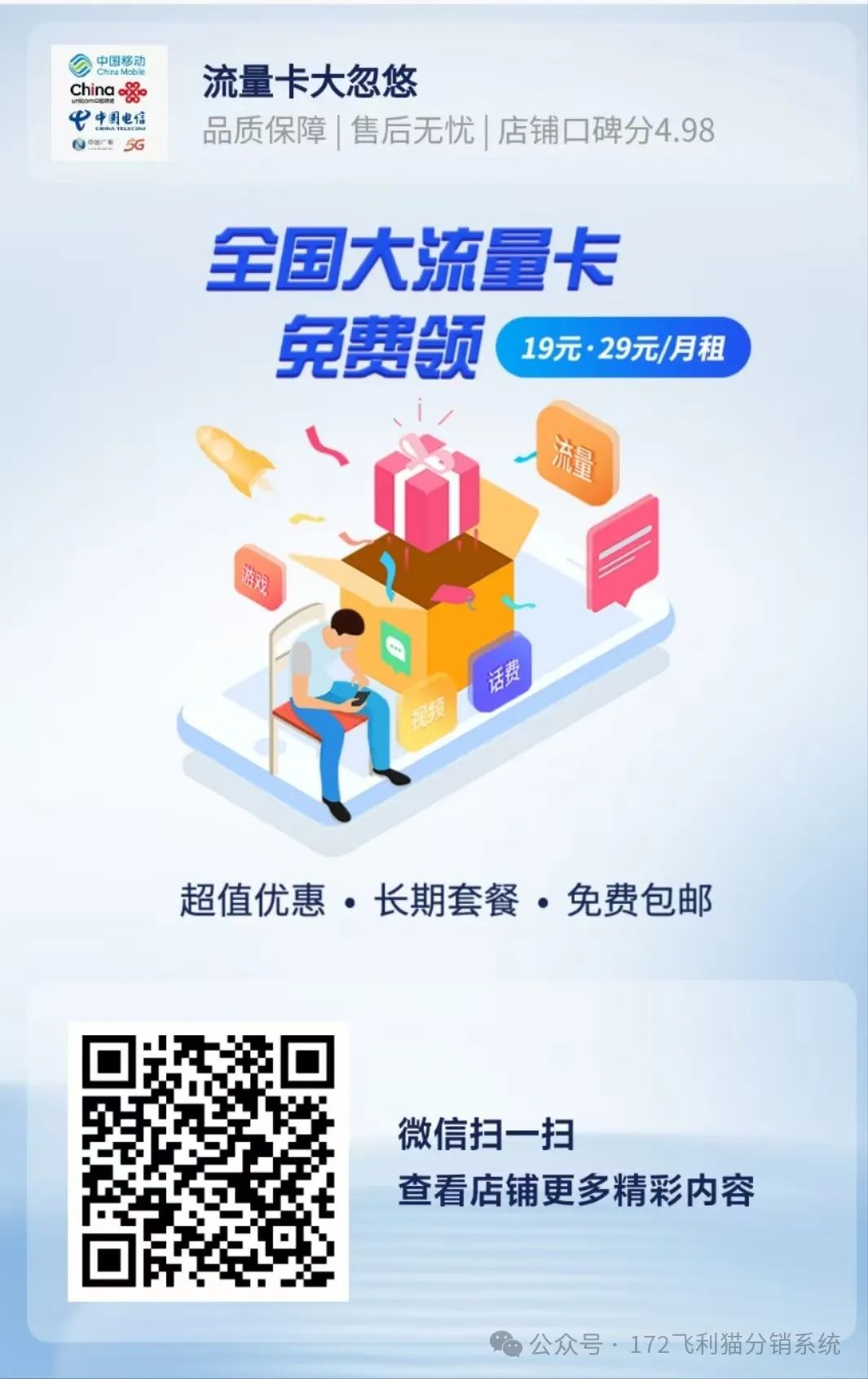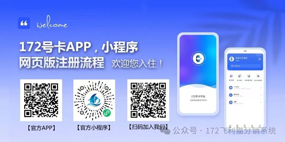 172号卡平台小程序已更新最新版ui 、超炫酷ui 页面新增功能部分功能,全国宽带年前上架,快来挑战黑钻、金钻了。后台可生成24年度账单官方一级代理注册方法:扫码(下方海报↓↓↓)注册: