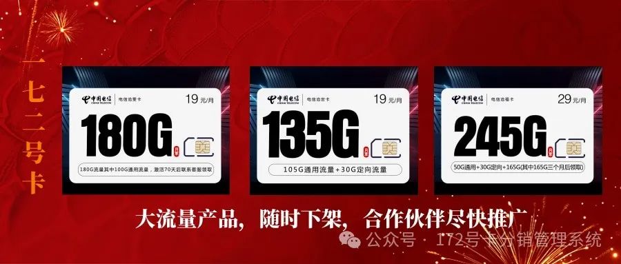 部分爆款最后上架阶段,初八后将下架大流量产品!持续常态化竞合,172号卡平台全系酬金、售后全网最优,支持接口对接,持续更新功能中。
